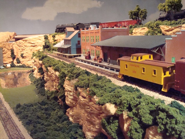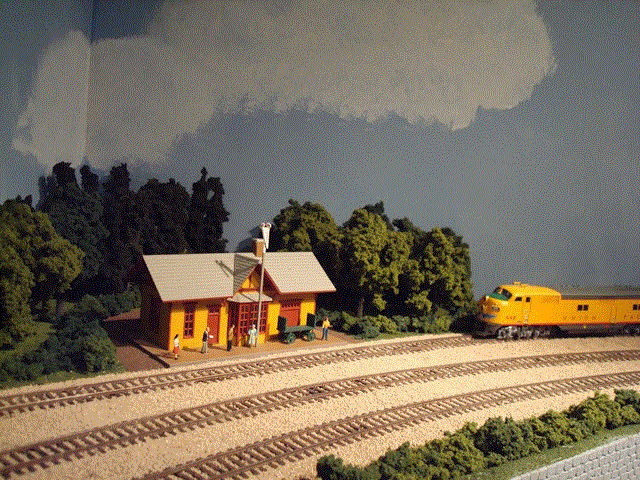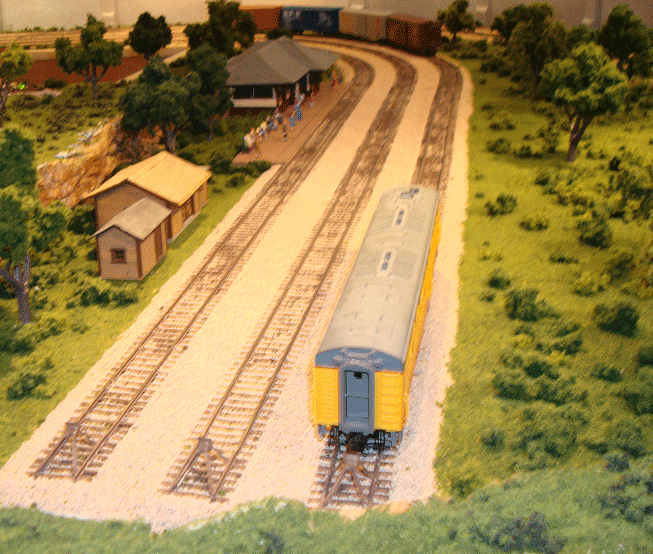Many trains arrive and depart Broken Bow yard. Arrivals are broken down and constructed for various destinations on the railroad. The first photo shows the two trains that remain overnight and are the first to leave each morning. Twice daily passenger trains arrive from Calgary and return. The track at the edge of the table is cleared during these arrivals as it is the inbound track for the passenger train. The fourth track from the left is the Eastbound Mainline and the track next to the stone wall is the Westbound Mainline. There are four double slip switches to facilitate movement from the Mainline and within the yard. The three left tracks curve as shown in the middle picture to the passenger station and two storage tracks as shown in the second photo. The third photo is the Broken Bow Passenger Station. |