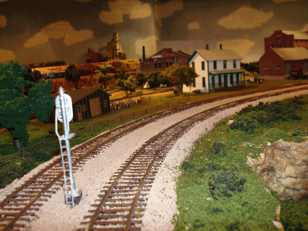 Continuing Eastbound around the peninsula from Benning you pass the backside of the Greatland Sugar Refinery. They are having a family day with a jug band and the kids flying kites. Next you pass the grade crossing at Red Deer with fully operational gates and flashing lights. The third photo shows the three stub tracks at Red Deer. The right stub goes to the Greatland Sugar refinery. A load of sugar beets arrive daily and empties are returned. The center track is for the C.M. St. P.&P. It is a freight house that transfers partial loads to waiting trucks. From here deliveries can also be made to the Spooner Sash & Door Co. A switcher has its home here and moves the empties from these two tracks to the left track for pickup. These empties are delivered back to Broken Bow for distribution. |