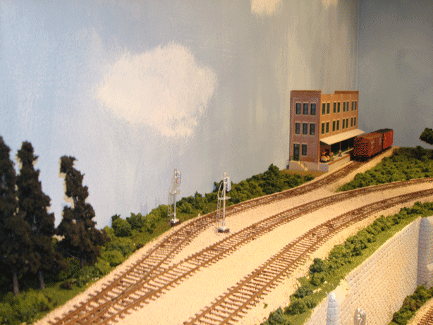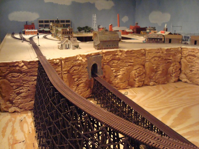 After leaving Nimrod, a train reenters the mid-level tunnel portal on the Westbound track in the first photo. It travels along the back wall to reemerge on the mid-level left track of the center photo. In the center photo the spur on the second level is Garrison as shown in the third photo. |